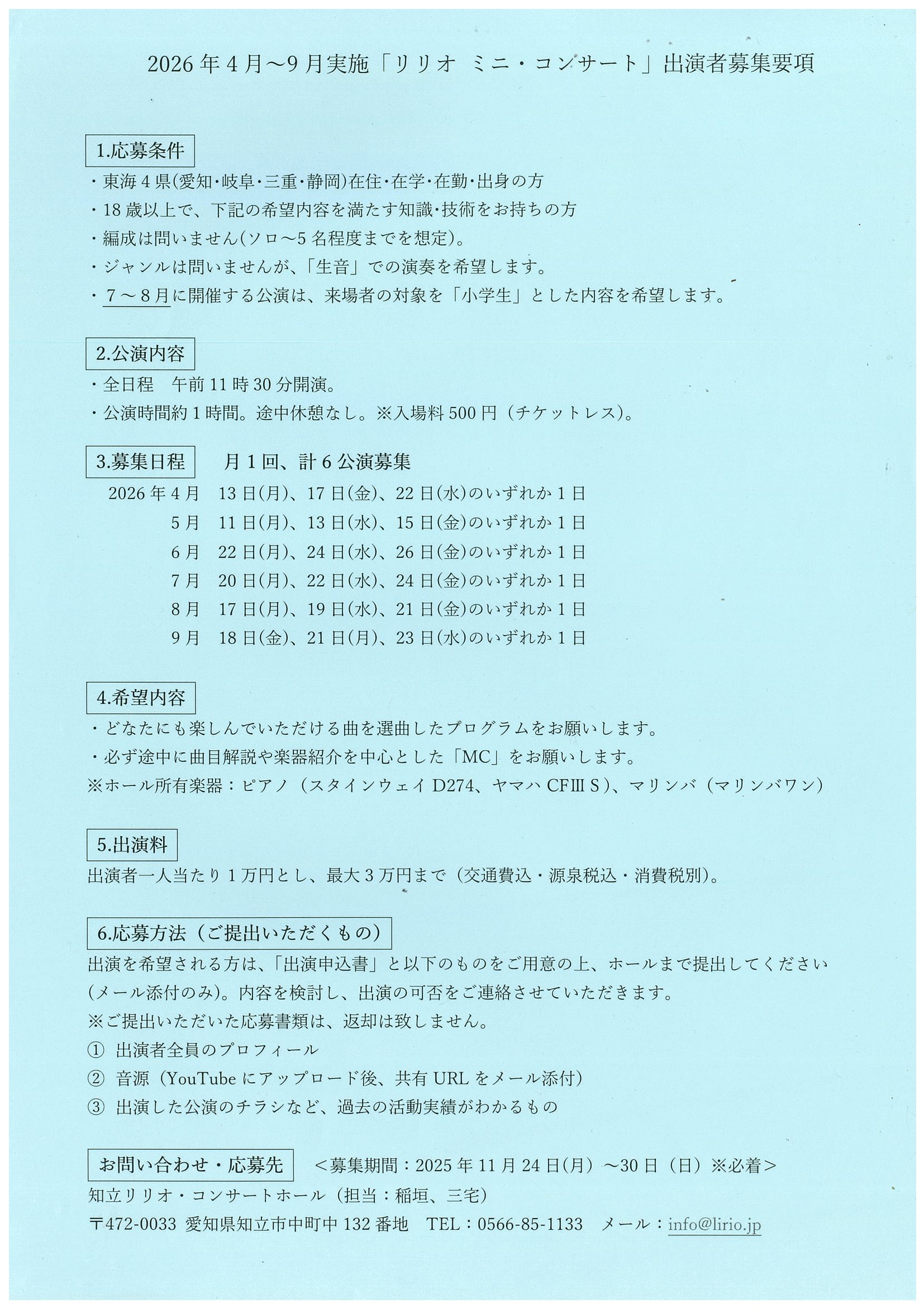 2026年4月~9月実施「リリオ ミニ・コンサート」出演者募集!