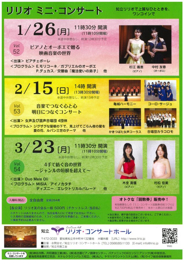 2026年1月~3月実施のリリオ ミニ・コンサート情報をUPしました。