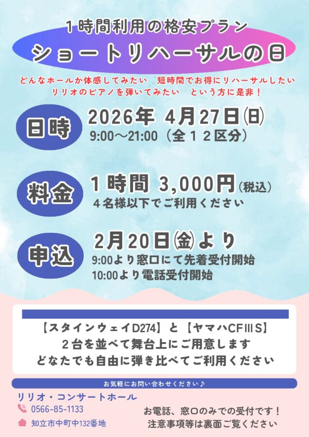【特別割引日】4月27日(日)ショートリハーサルについて【告知】